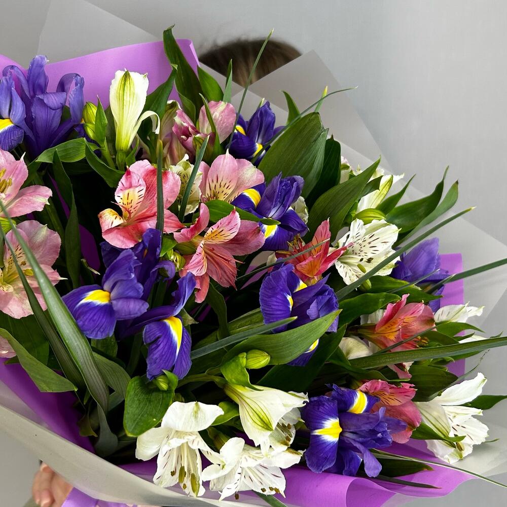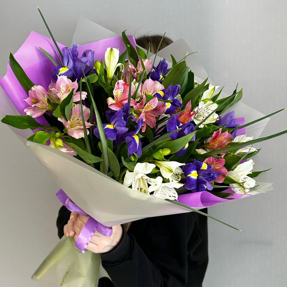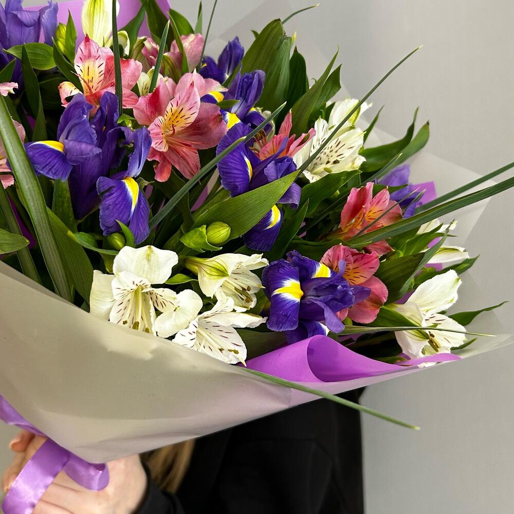 Альстромерия – 8 шт.Ирис – 7 шт.Зелень – 3 шт.Лента атласная – 2 шт.Упаковка дизайнерская – 2 шт.