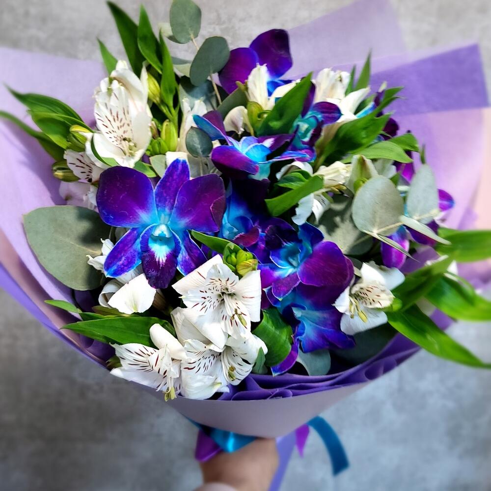 Альстромерия – 4 шт.Эвкалипт – 3 шт.орхидея – 8 шт.Упаковка дизайнерская – 1 шт.