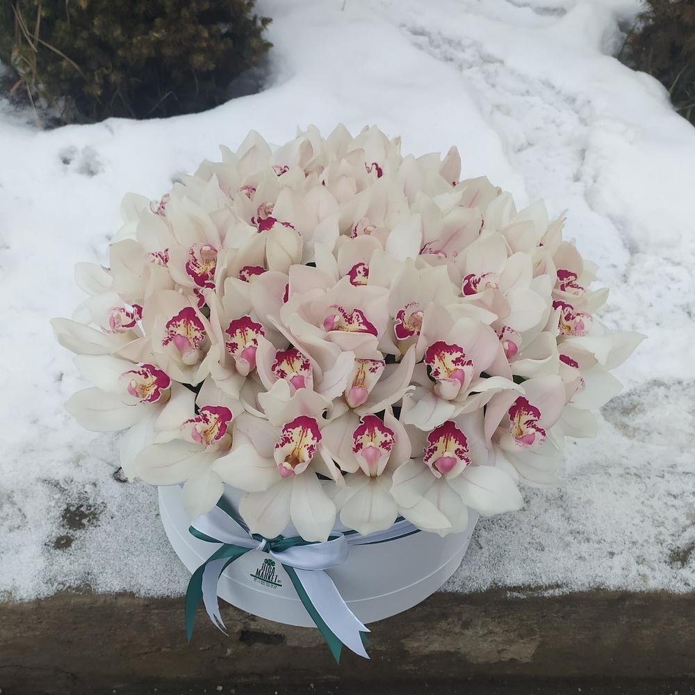 Лента атласная – 1 шт.Коробка шляпная – 1 шт.Оазис флористический – 3 шт.Цимбидиум белый – 45 шт.