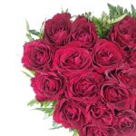 Composition in the form of heart from the single-headed red roses framed with fern. It is not necessary for the vase, because the roses are in floral oasis and get the necessary water out of it