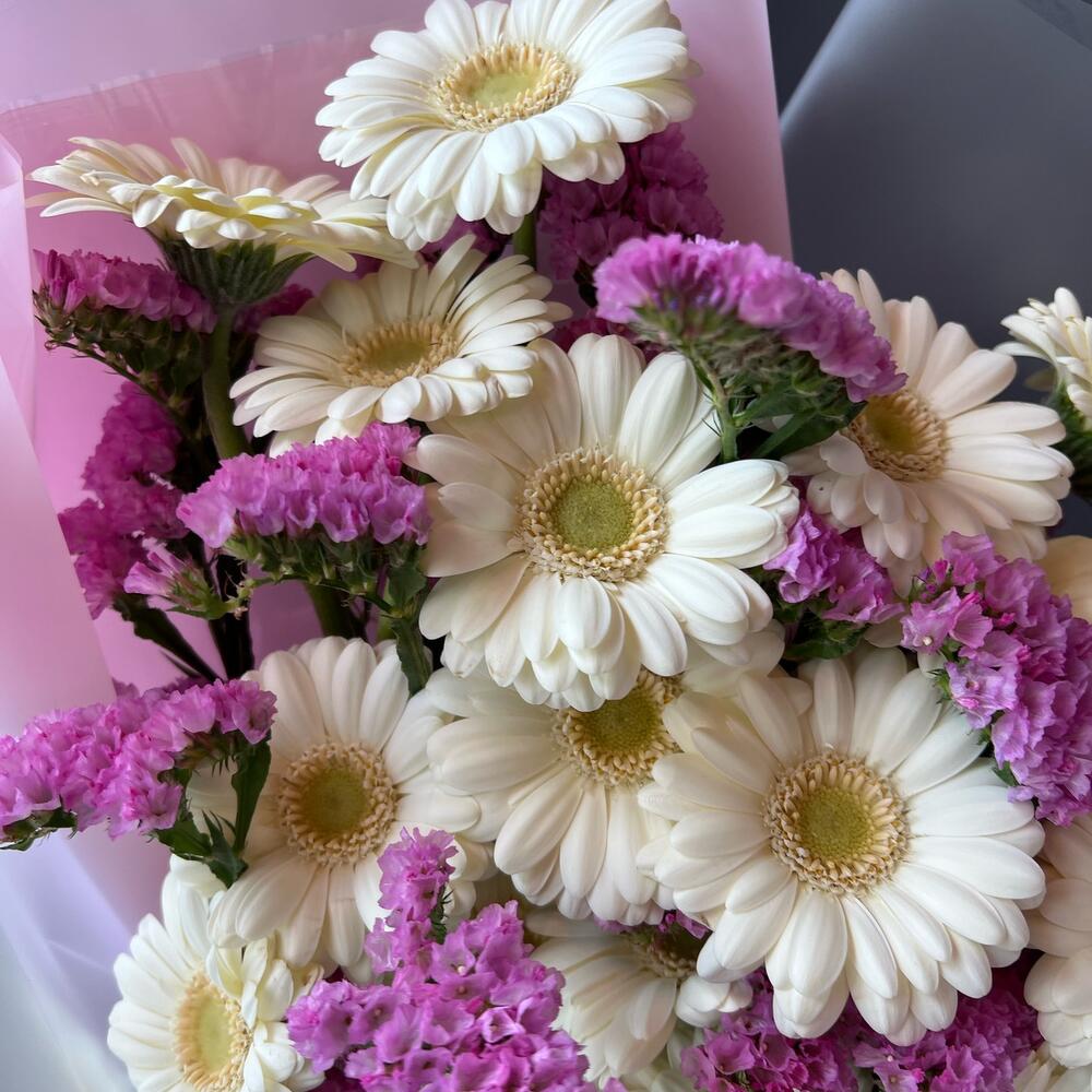 Букет с белыми Герберами и сиреневой статицей