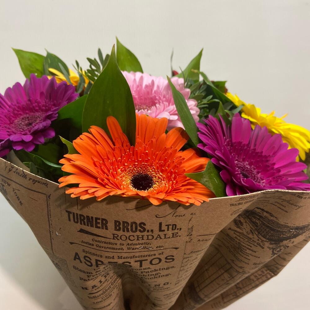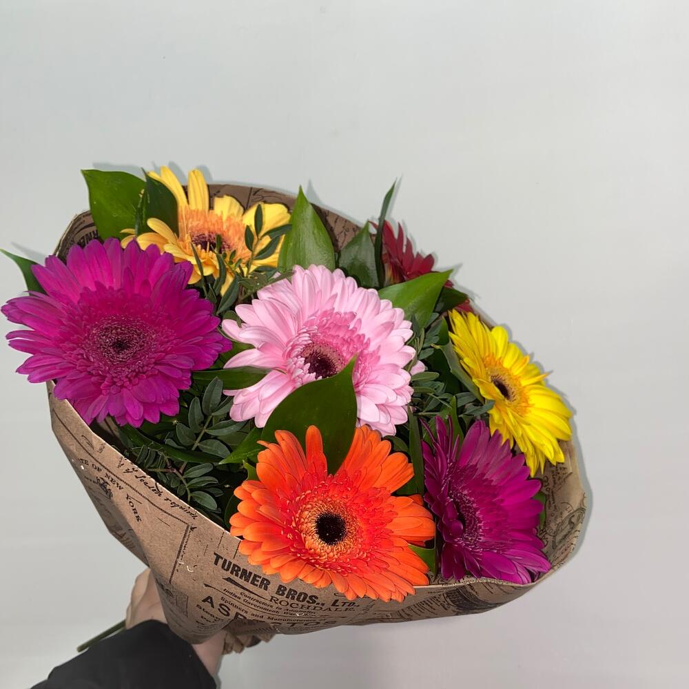 гербера микс – 7 шт.Рускус – 11 шт.Фисташка – 2 шт.Упаковка крафт дизайнерский – 1 шт.Лента – 1 шт.