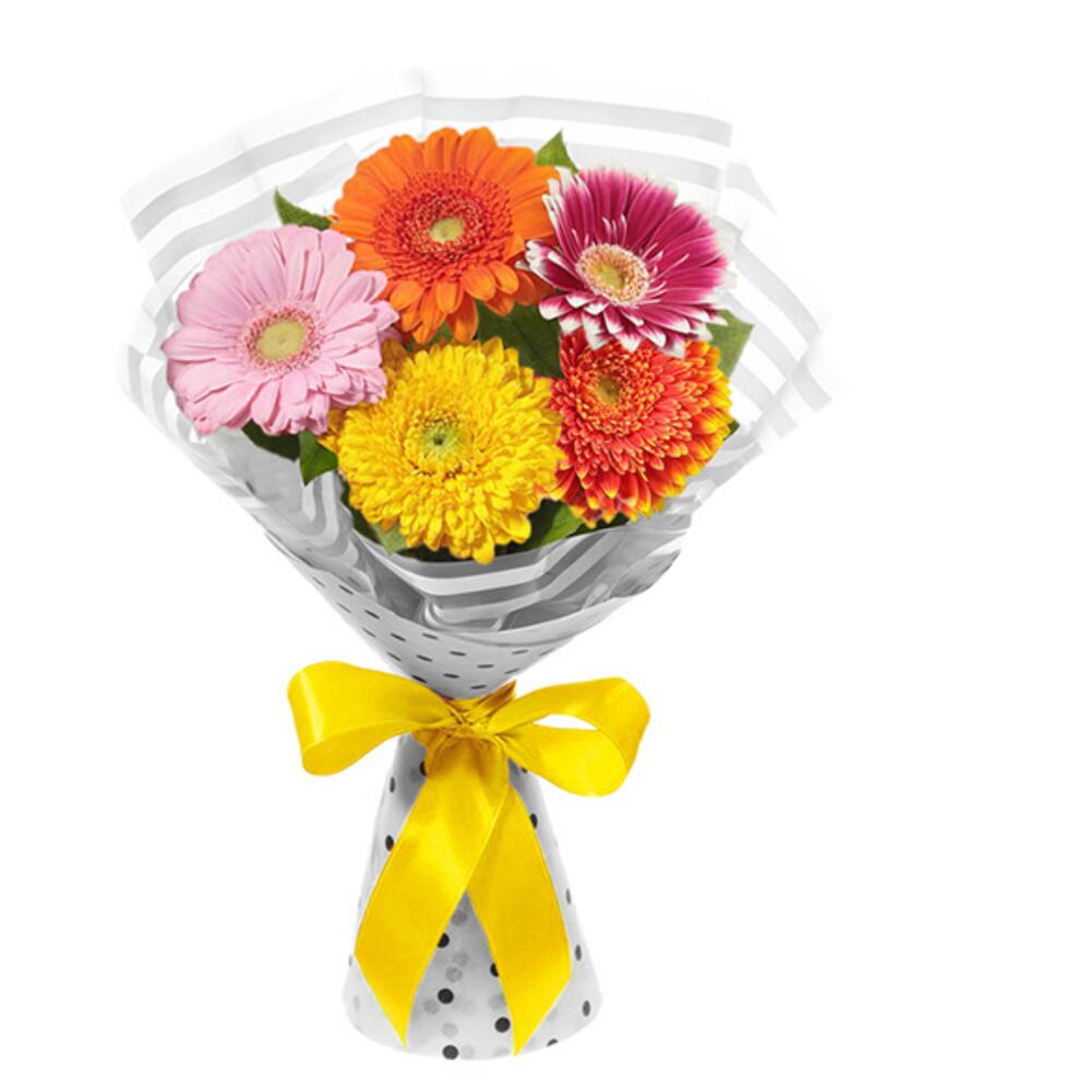 Салал – 1 шт.пленка цветная – 1 шт.лента атласная (желтый) – 1 шт.гербера (оранжевый) – 1 шт.гербера (желтый) – 1 шт.гербера (розовый) – 2 шт.гербера (малиновый) – 1 шт.