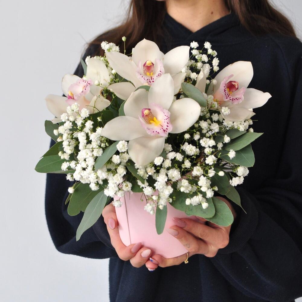 Гипсофила – 1 шт.Орхидея Цимбидиум – 5 шт.Эвкалипт – 1 шт.Коробка – 1 шт.Оазис флористический – 1 шт.
