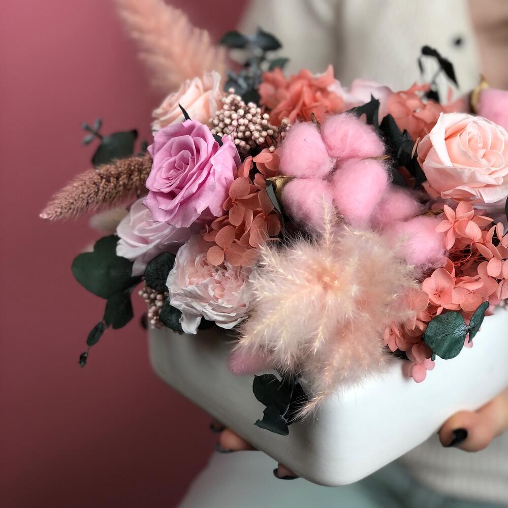 Композиция авторская из стабилизированых цветов. Ваза керамическая.Не требует ухода и полива, срок жизни 5-7 лет при соблюдении рекомендаций.