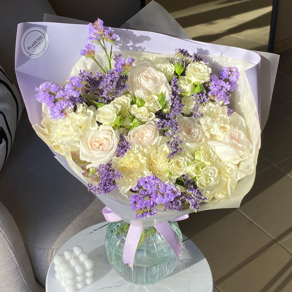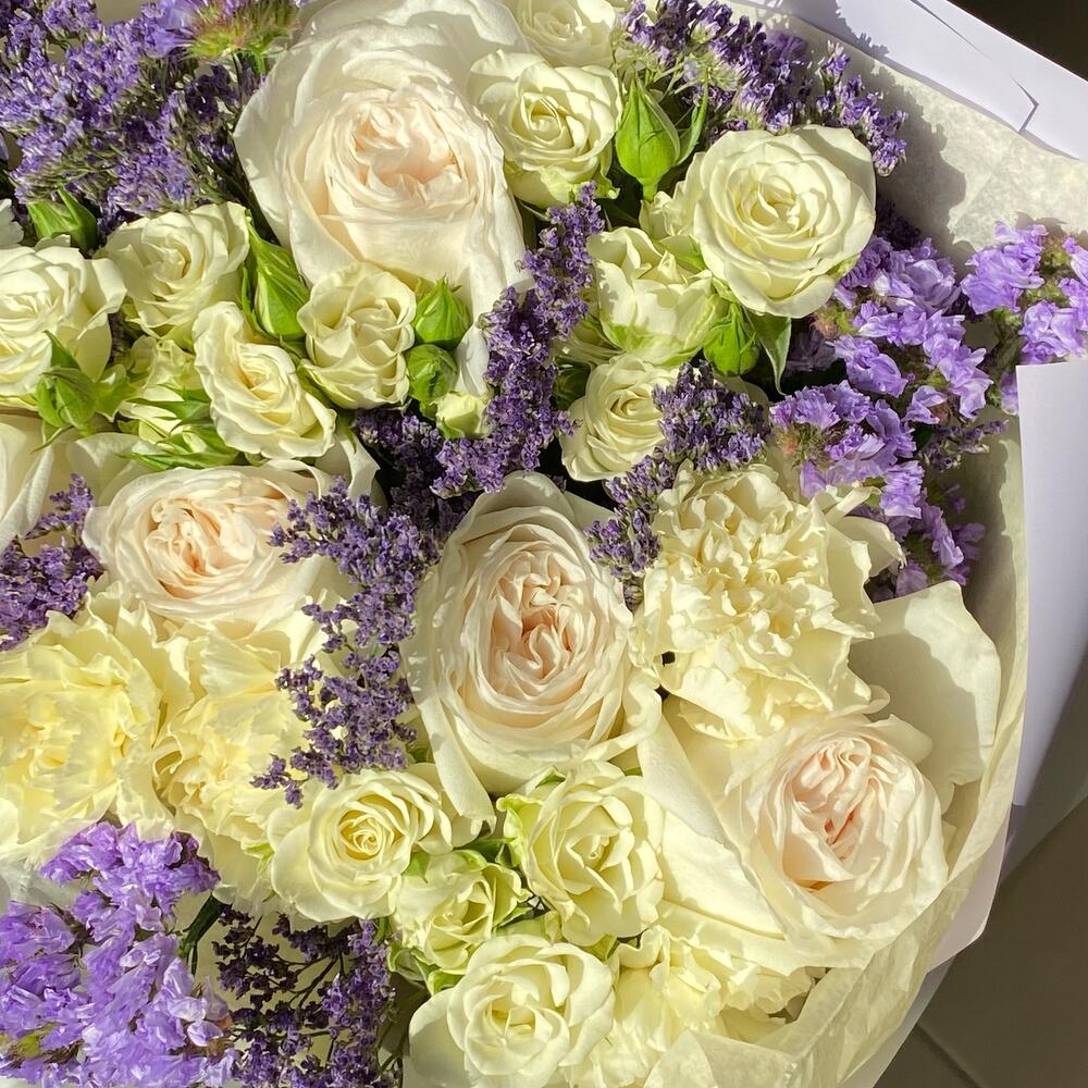 пионовидные розы – 5 шт.кустовые белые розы – 3 шт.Диантус лимонный – 5 шт.Статица фиолетовая – 7 шт.лимончики сиреневый – 3 шт.Фирменная упаковка – 1 шт.