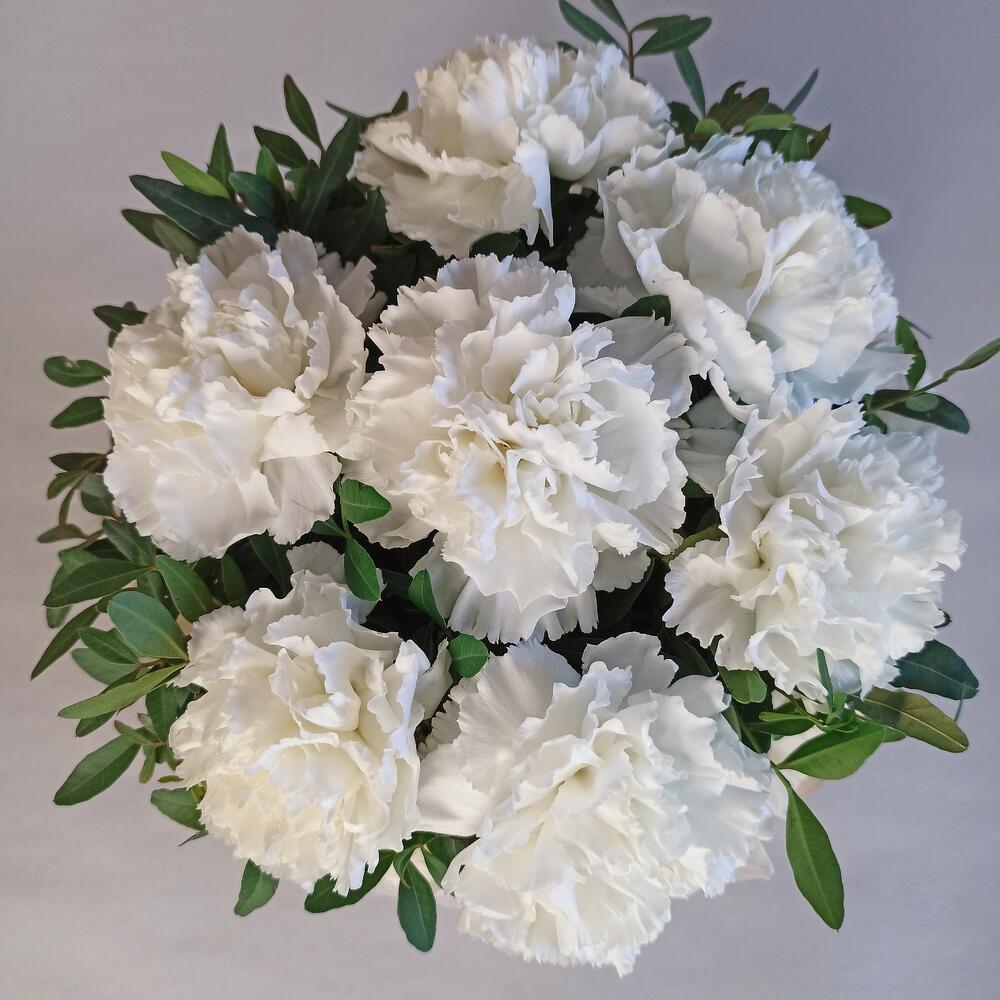 Гвоздика – 7 шт.Лента атласная – 2 шт.Тишью – 1 шт.Коробка шляпная – 1 шт.Оазис флористический – 1 шт.зелень декоративная – 3 шт.