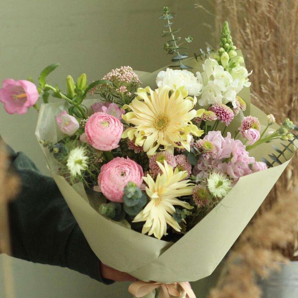 гербера кудрявая – 2 шт.Ранункулюс – 2 шт.Колокольчик – 1 шт.Маттиола – 1 шт.Львиный зев – 1 шт.Озотамнус – 1 шт.тмин – 2 шт.Диантус – 2 шт.Эвкалипт – 3 шт.Упаковка – 1 шт.