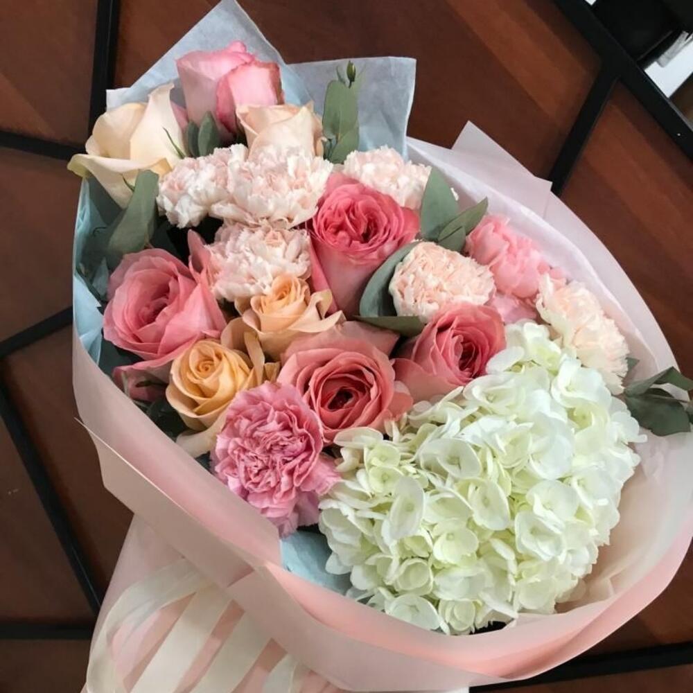 Альстромерии, Гвоздики, Кустовые розы, Лизиантусы, Розы, Хризантемы
