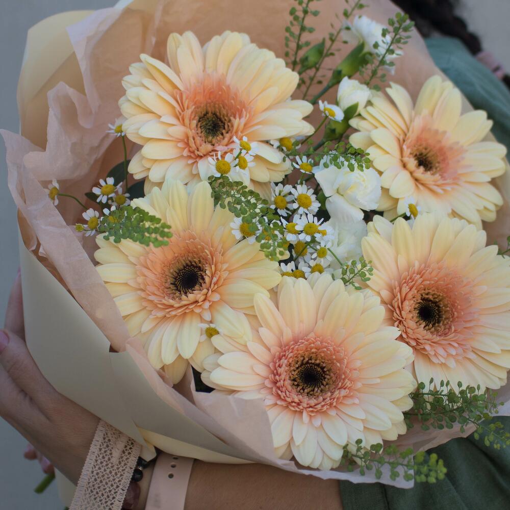 Гербера – 5 шт. Танацетум – 2 шт. диантс – 2 шт.