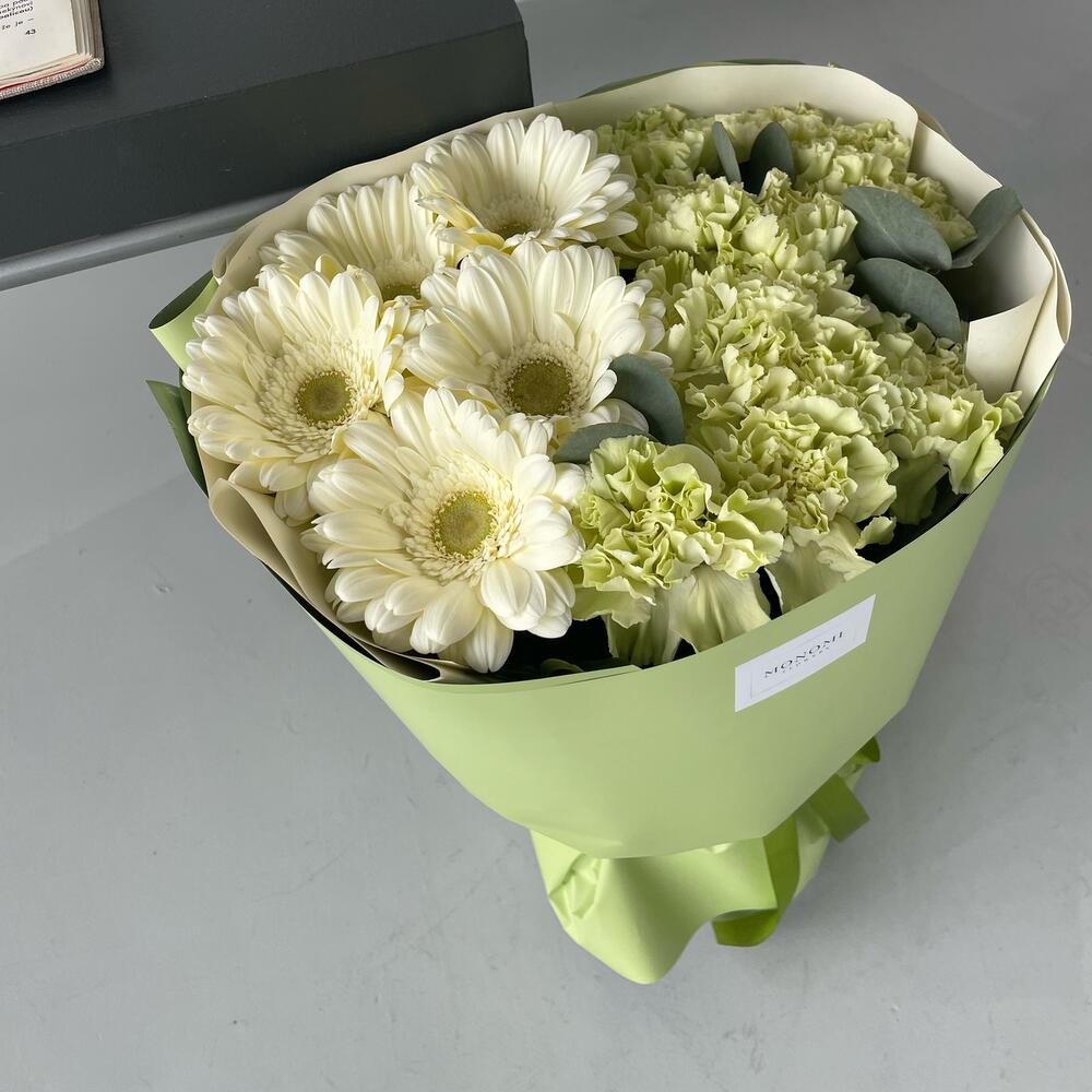 Гербера – 5 шт.Диантус – 14 шт.Эвкалипт – 3 шт.Упаковка дизайнерская – 2 шт.Лента атласная – 1 шт.наклейка фирменная – 1 шт.