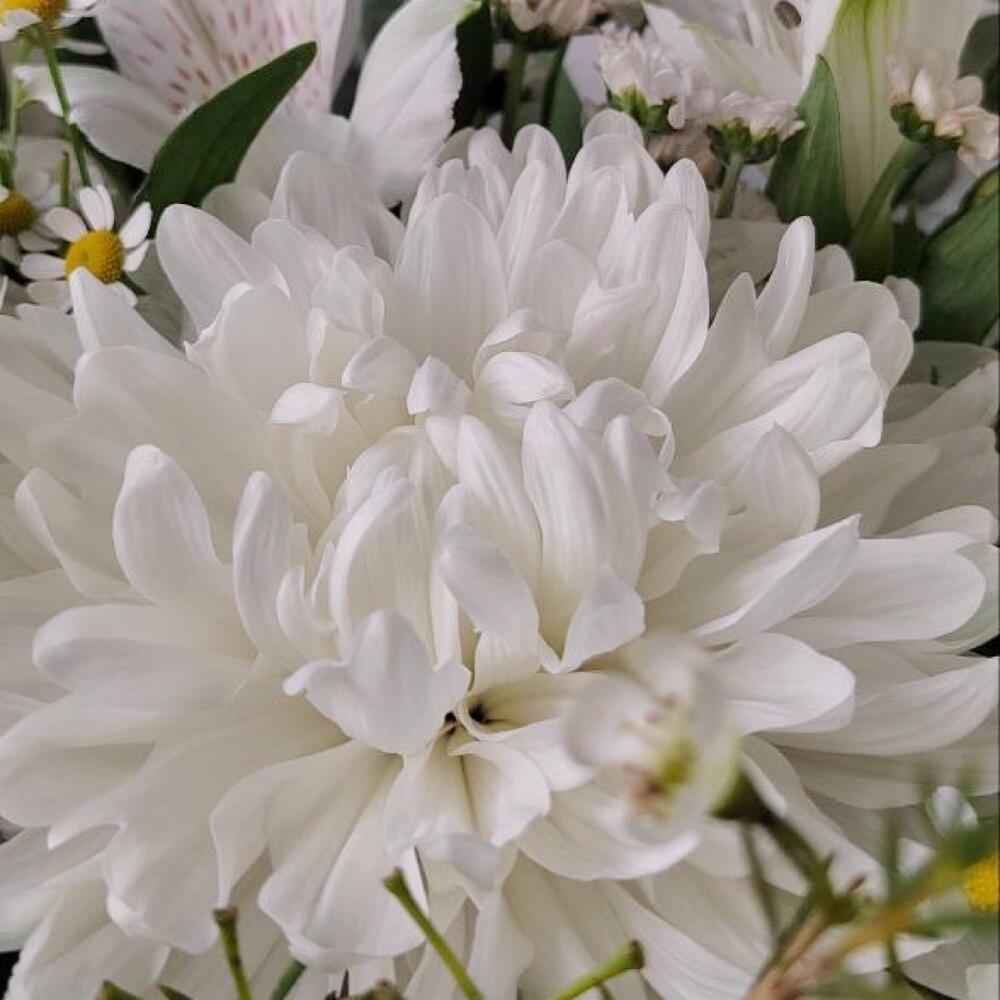 Альстромерия – 2 шт.Эвкалипт – 4 шт.Лента атласная – 3 шт.Ромашка кустовая – 3 шт.Хризантема одноголовая – 1 шт.Упаковка дизайнерская – 3 шт.эустома белая – 2 шт.