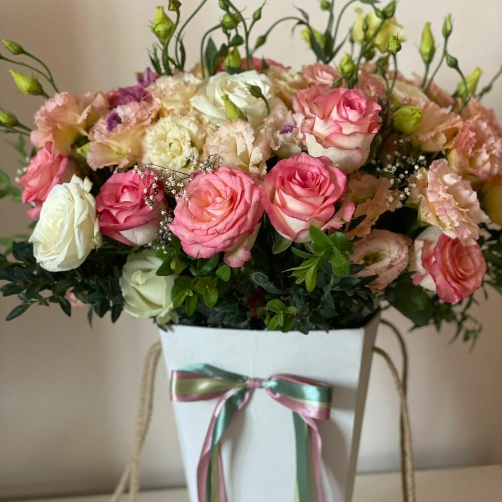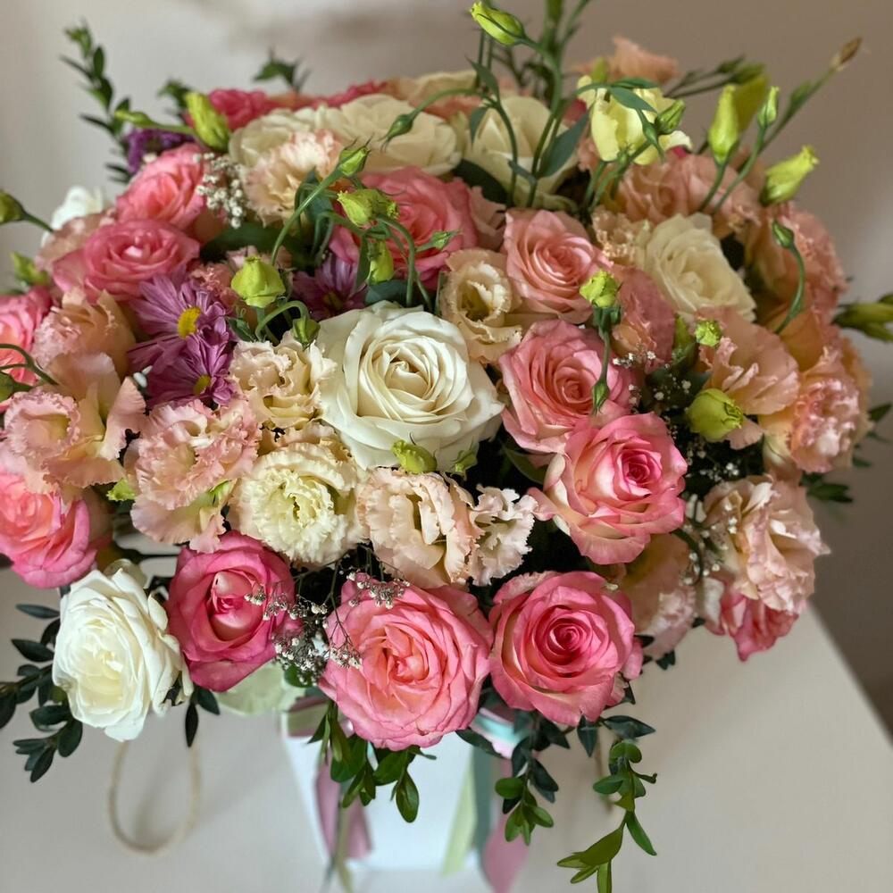 Альстромерии, Гвоздики, Кустовые розы, Лизиантусы, Розы, Хризантемы