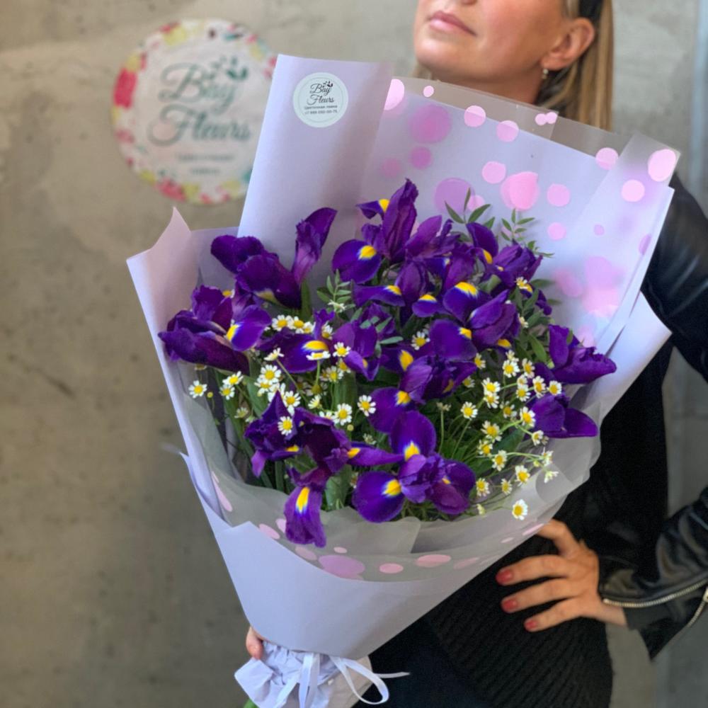 Ирис – 15 шт.Матрикария – 2 шт.Фисташка – 5 шт.Упаковка дизайнерская – 1 шт.Лента атласная – 1 шт.