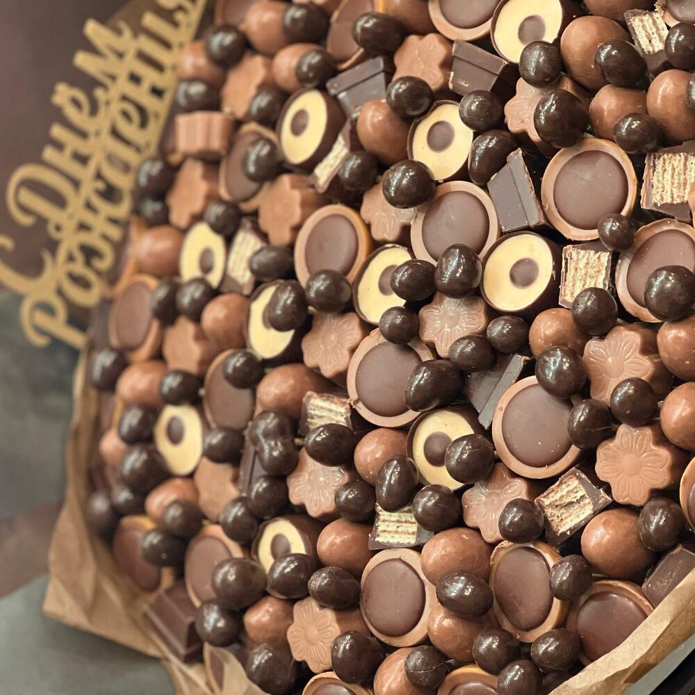 конфеты камильфо – 12 шт.конфеты милка – 24 шт.Ириски – 25 шт.орехи в шоколаде – 50 шт.ритерспорт – 25 шт.Упаковка дизайнерская – 3 шт.работа флориста – 1 шт.Лента атласная – 1 шт.чоко бонс – 20 шт.