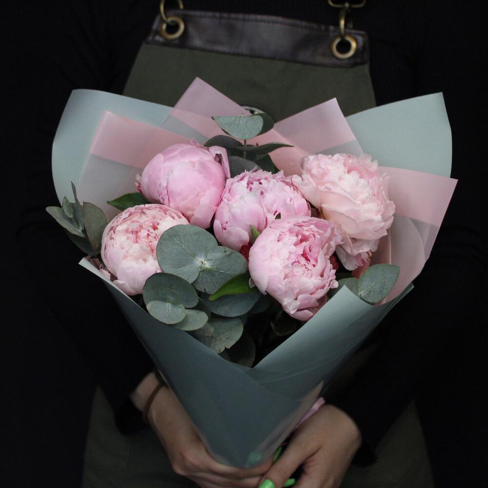 Пион Сара Бернар – 5 шт.Эвкалипт – 3 шт.Пленка матовая – 3 шт.Лента атласная – 2 шт.