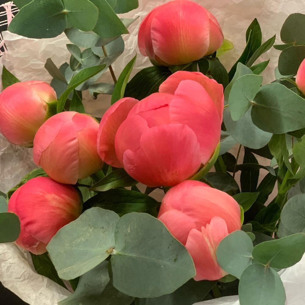 Тишью – 3 шт.Атласная лента – 1 шт.Дизайнерская упаковка – 1 шт.пионы – 7 шт.Эвкалипт – 1 шт.