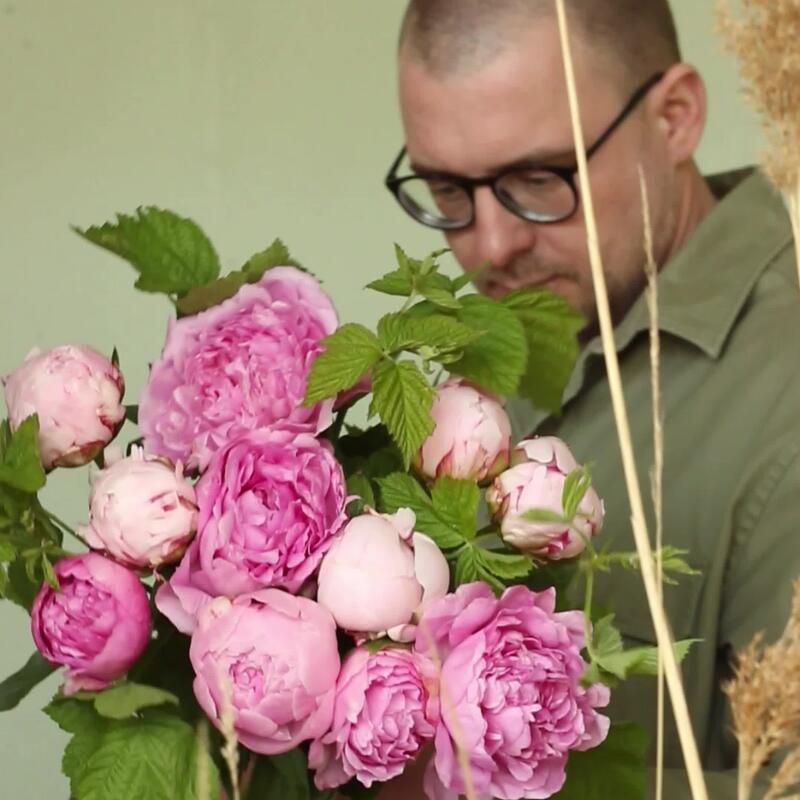 Охапка нежных пионов с веточками малины.