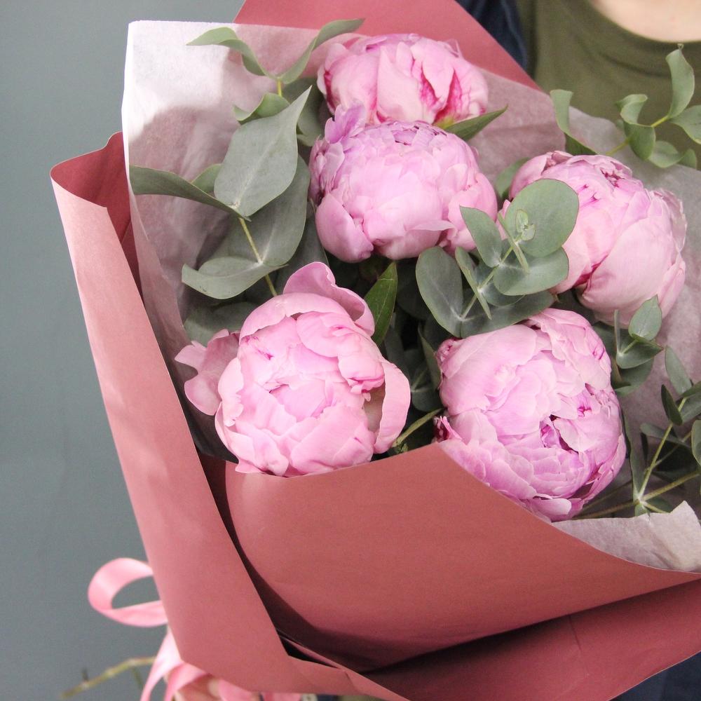 Пион – 5 шт.Эвкалипт – 4 шт.Лента атласная – 1 шт.Тишью – 1 шт.Бумага – 2 шт.