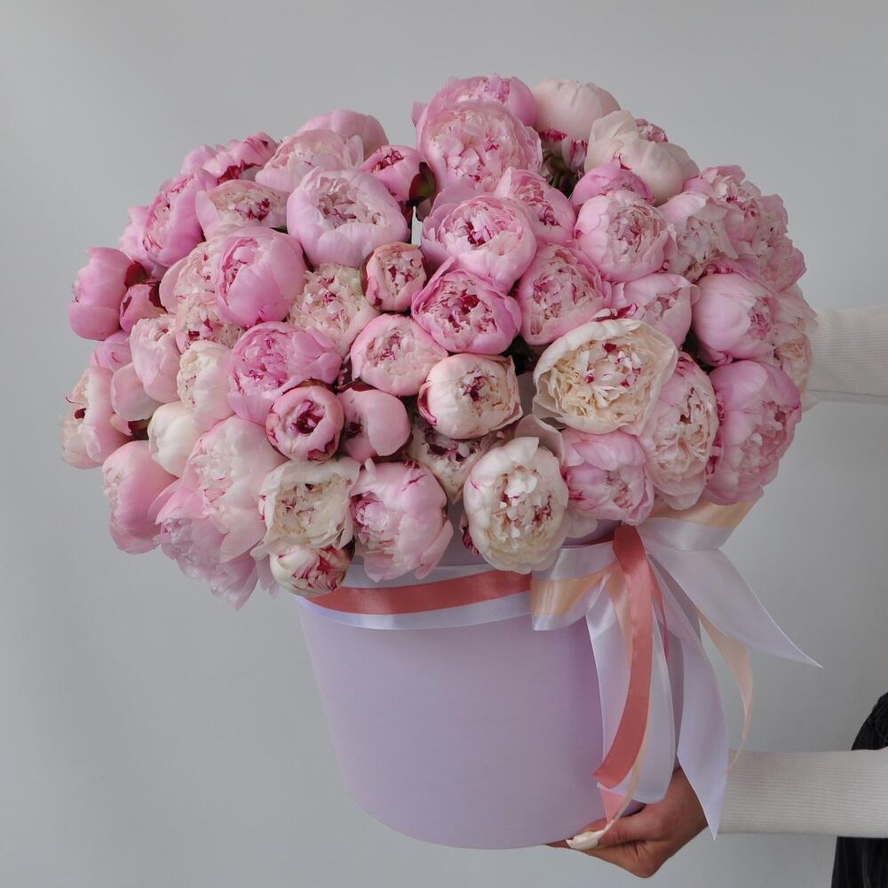 Лента атласная – 1 шт.Коробка шляпная – 1 шт.Пион Сара Бернар – 65 шт.Оазис флористический – 3 шт.