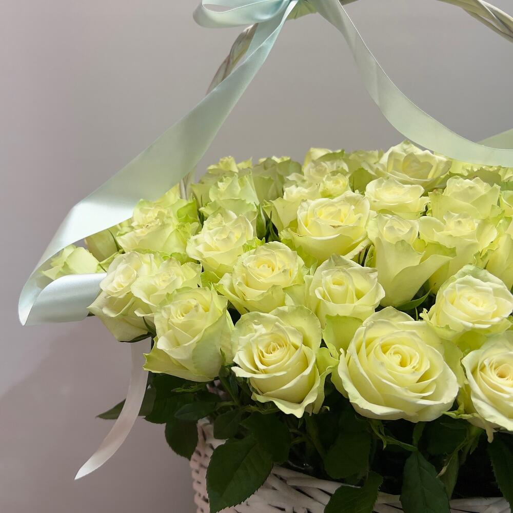 101 белая роза в корзине