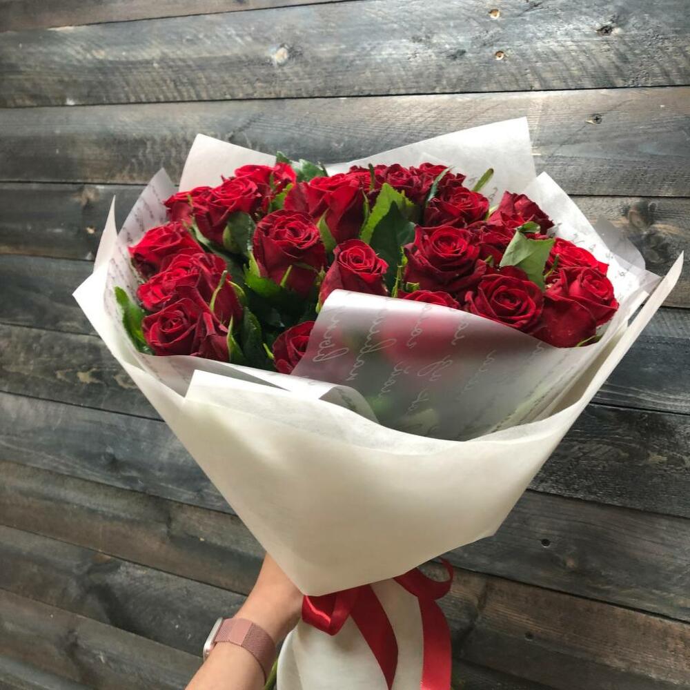 Лента – 1 шт.Упаковка – 2 шт.Роза красная 50 см – 25 шт.