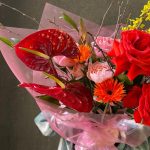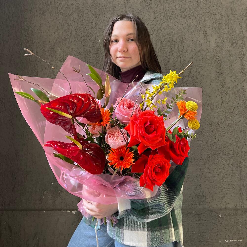 Пионовидная роза – 5 шт.Антуриум – 2 шт.Гербера сортовая – 3 шт.Форзиция – 1 шт.Краспедия – 2 шт.Зелень – 5 шт.Роза кустовая пионовидная – 1 шт.Упаковка дизайнерская – 3 шт.