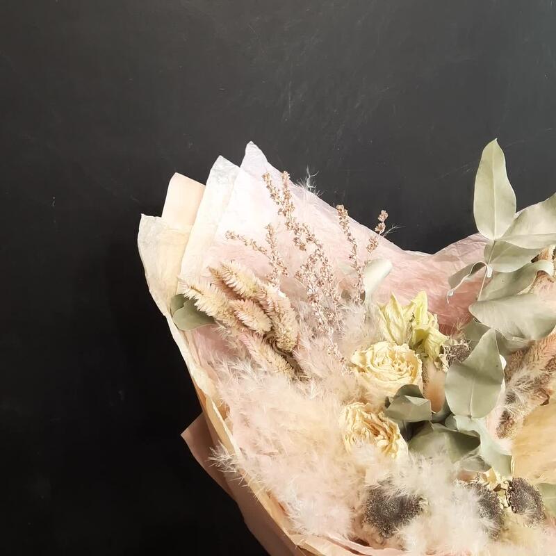 Целозия – 3 шт.Эвкалипт – 3 шт.Роза – 3 шт.Подсолнух – 4 шт.Лагурус – 7 шт.Дизайнерская упаковка – 1 шт.кортадерия – 1 шт.