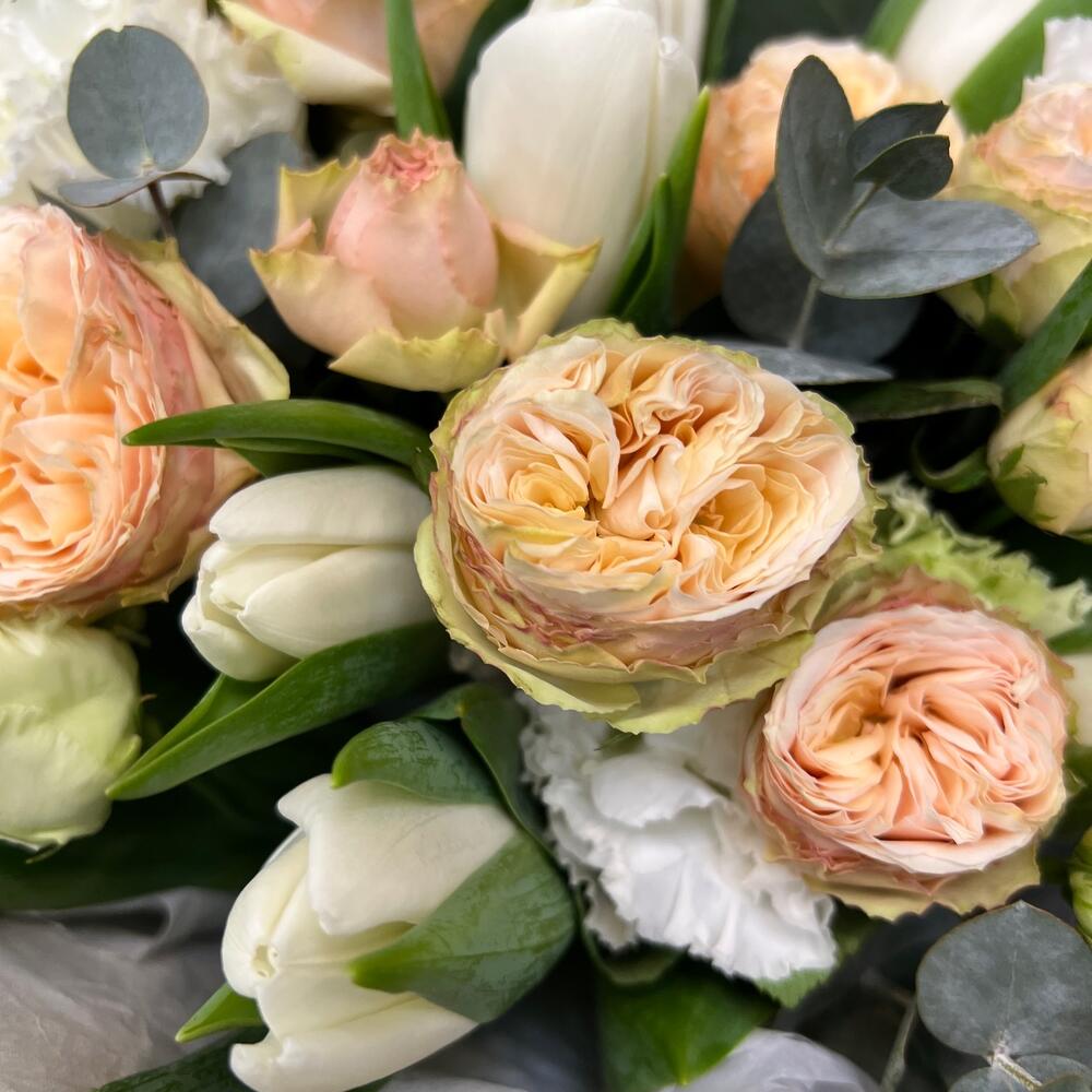 Эвкалипт – 2 шт.Лента атласная – 2 шт.Тишью – 2 шт.Тюльпан белый – 9 шт.Пленка матовая – 3 шт.Эустома белая махровая – 1 шт.роза кустовая пионовидная трендсеттер – 2 шт.