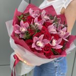 Букет Бурж с красными розами и цимбидиумом