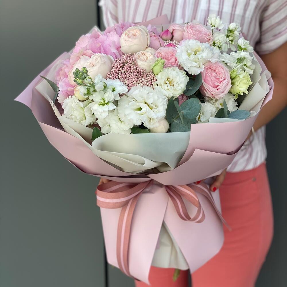 Букет Филинг из гортензии, пионовидной розы, озотамнуса и маттиолы