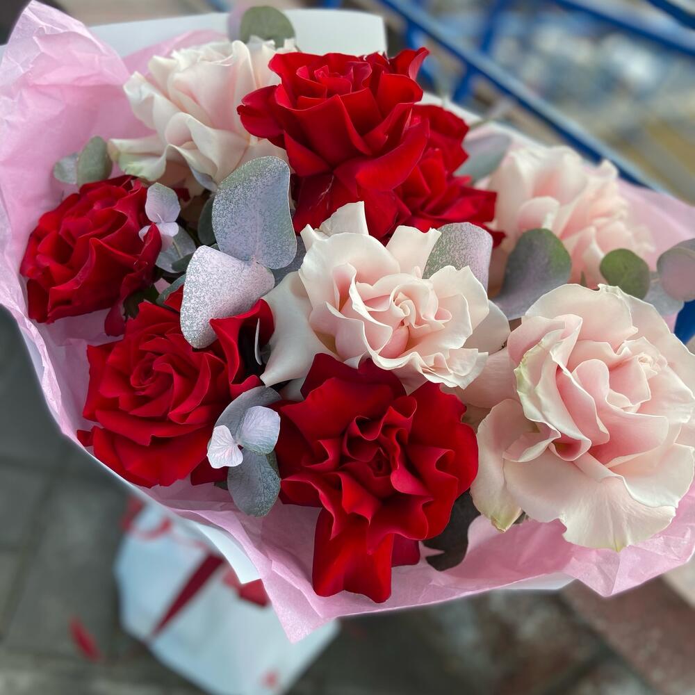 Французская роза – 9 шт. Эвкалипт – 1 шт. Упаковка дизайнерская – 1 шт.