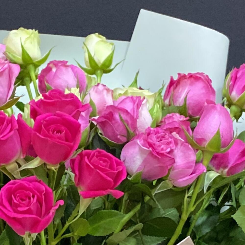 Лента – 4 шт. Роза кустовая – 15 шт. Тишью – 2 шт. Слюда упаковка – 2 шт. салфетка декоративная – 5 шт.