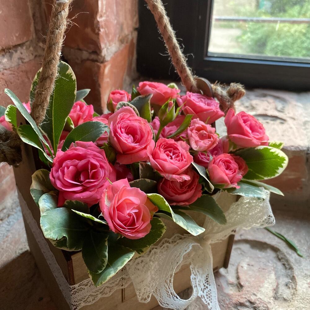 Роза кустовая – 7 шт.Питтоспорум – 3 шт.Ящик деревянный – 1 шт.Оазис флористический – 1 шт.Лента – 1 шт.