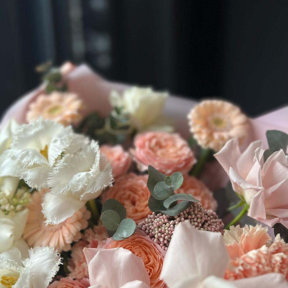 Кустовая пионовидная роза – 2 шт.Одноголовая роза – 6 шт.Гербера – 3 шт.Тюльпан – 3 шт.Озотамнус – 1 шт.Сирень – 1 шт.Эвкалипт – 3 шт.декоративная упаковка – 1 шт.Атласная лента – 1 шт.