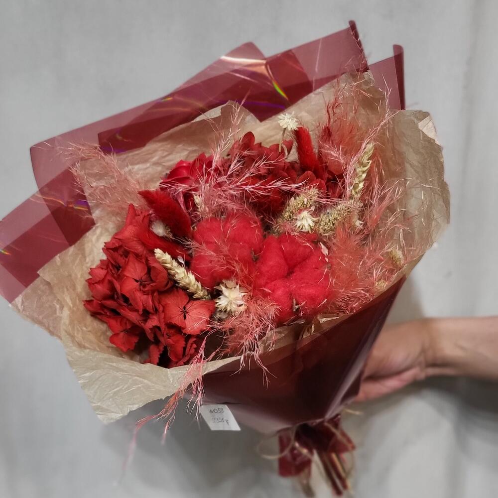 Хлопок – 2 шт.Гортензия – 2 шт.роза мыльная – 1 шт.Лагурус (сухоцвет) – 5 шт.Тритикале – 5 шт.кортадерия – 1 шт.