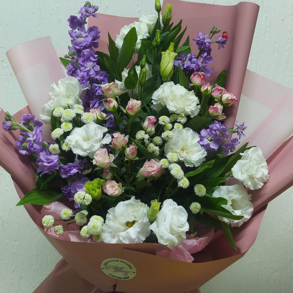 Кустовая роза – 3 шт. маттиола лиловая – 5 шт. Лизиантус Алиса белый – 5 шт.
