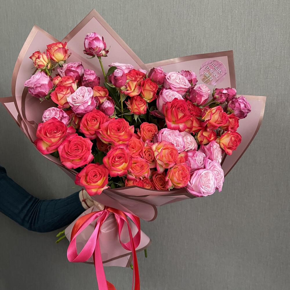 В этом букете вы найдете кустовые розы различных сортов, каждая из которых обладает своей уникальной красотой и очарованием. Розы могут быть разных цветов. Мы гарантируем, что все цветы в букете свежие и качественные. Доставка по Тбилиси абсолютно бесплатная.