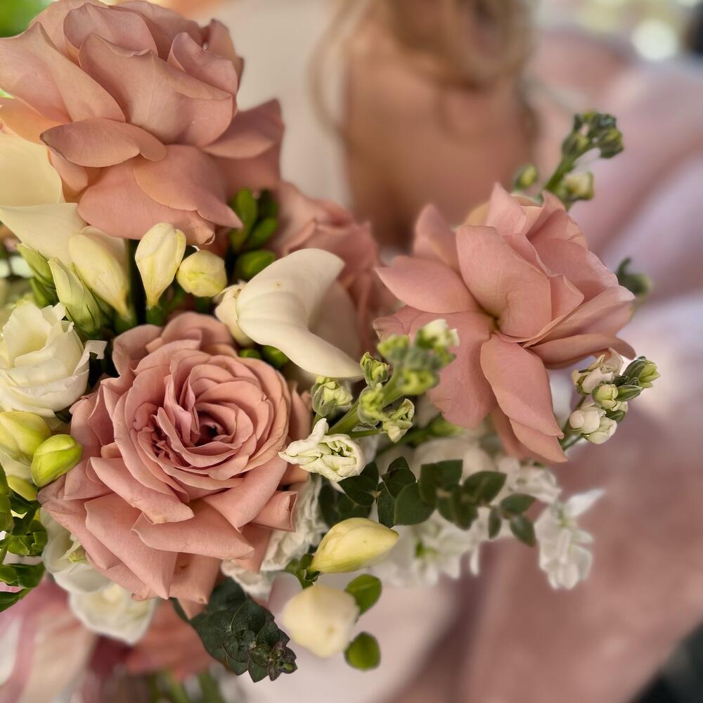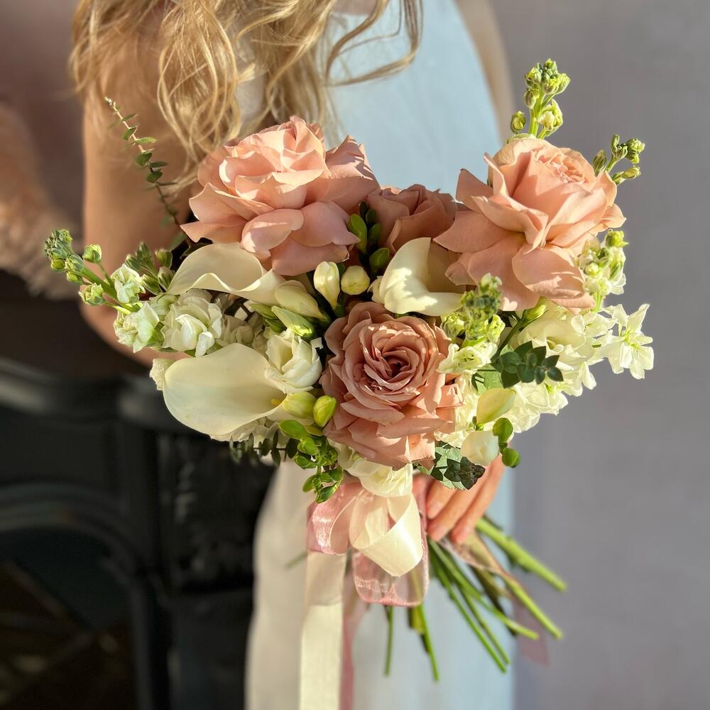 Пионовидная роза – 5 шт.Маттиола – 5 шт.Фрезия – 5 шт.Калла – 3 шт.Лизиантус – 5 шт.Эвкалипт – 3 шт.Атласная лента – 1 шт.