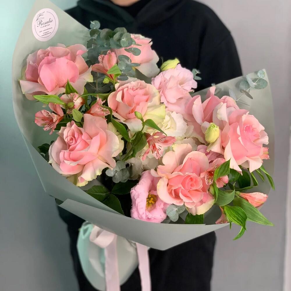 Альстромерии, Гвоздики, Кустовые розы, Лизиантусы, Розы, Хризантемы