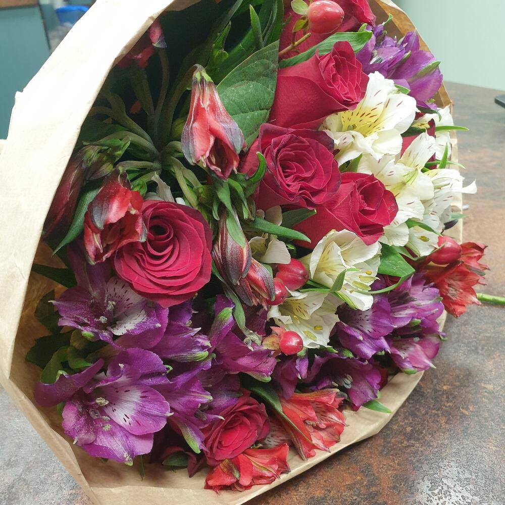 Альстромерия – 9 шт.Роза 60 см – 13 шт.Гиперикум красный – 3 шт.Упаковка дизайнерская – 1 шт.