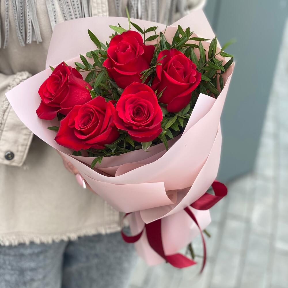 Букет из 5 красных роз и зелени в оформлении!