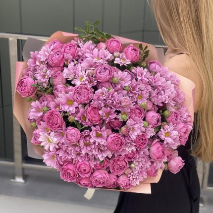 Букет Юбилейный из кустовых пионовидных роз и хризантемы