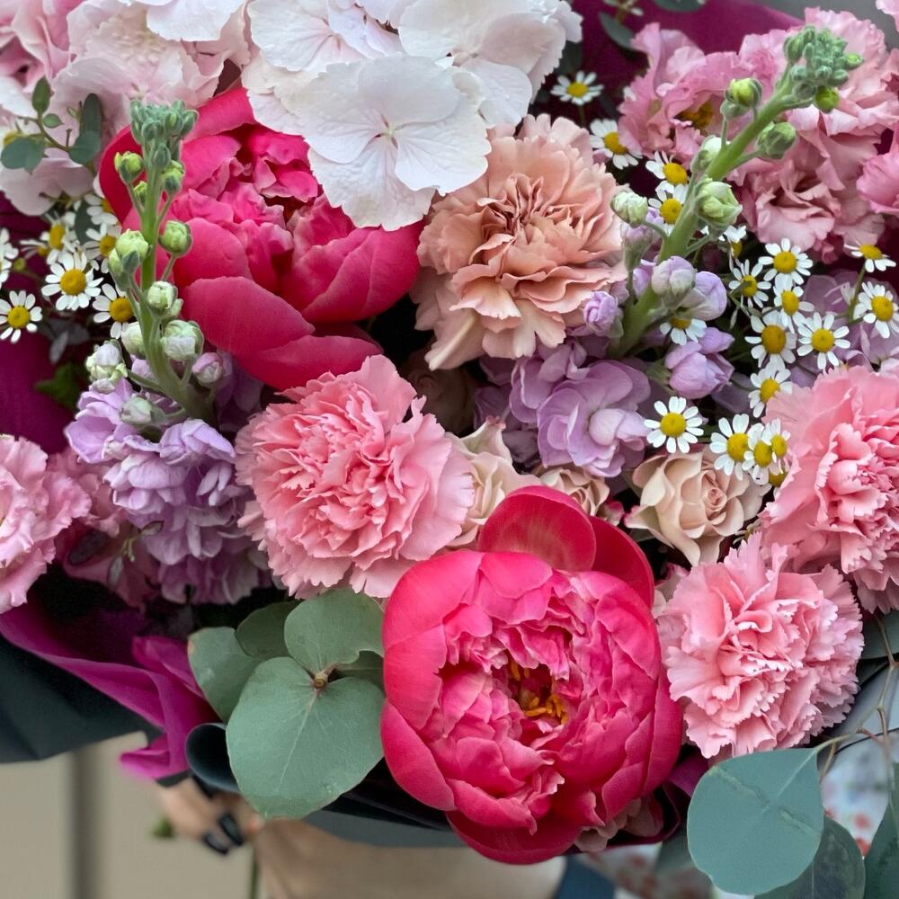 Гортензия розовая – 1 шт.Пион – 2 шт.Кустовая роза – 1 шт.Эустома – 1 шт.Маттиола – 3 шт.Гвоздика – 4 шт.Ромашка кустовая – 2 шт.Эвкалипт – 2 шт.Фисташка – 2 шт.Тишью – 2 шт.Упаковка дизайнерская – 2 шт.Лента атласная – 2 шт.