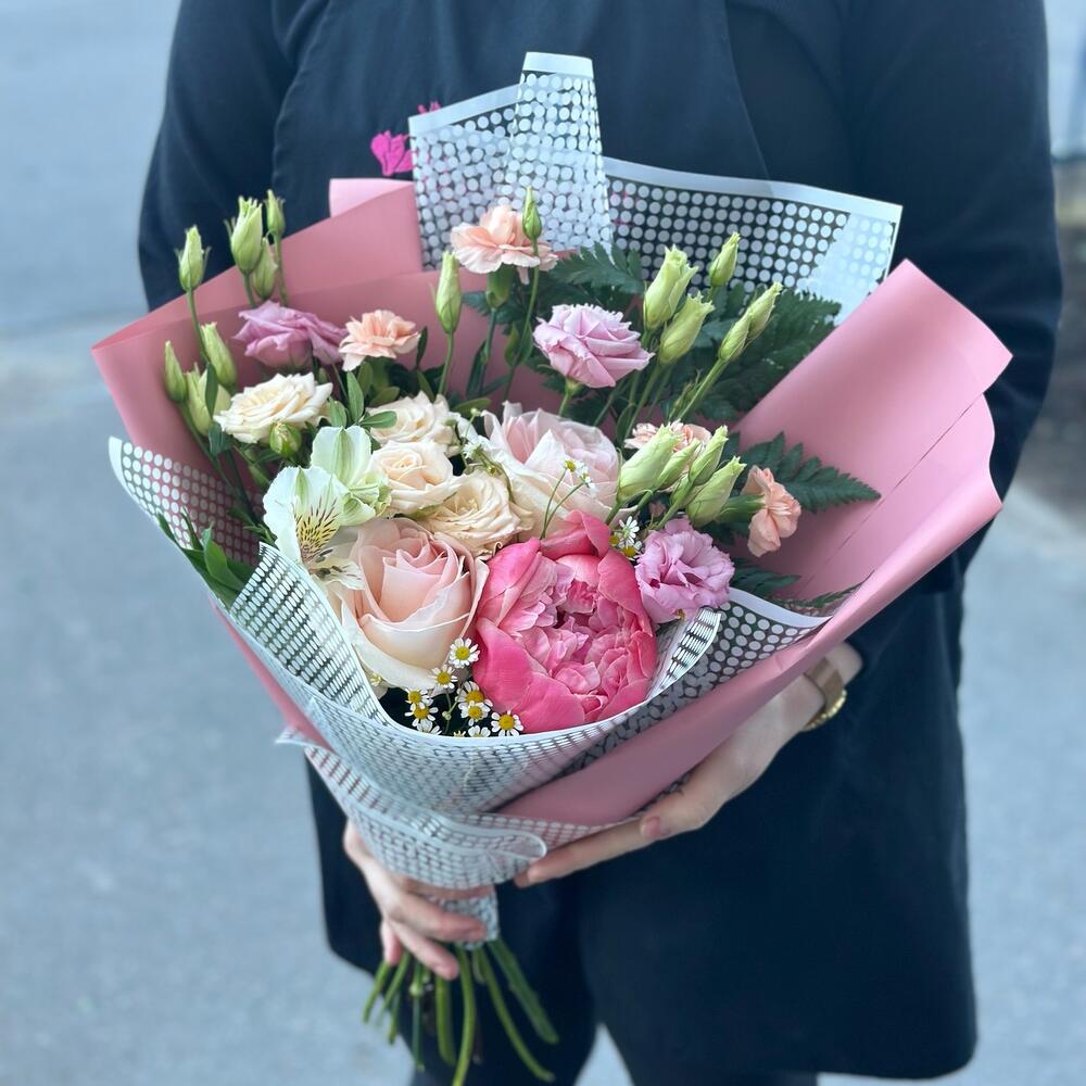 Пион – 1 шт.Роза Эквадор – 2 шт.Роза кустовая – 1 шт.Матрикария – 1 шт.Диантус кустовой – 2 шт.Лизиантус – 2 шт.Альстромерия – 1 шт.пароротник – 1 шт.Упаковка дизайнерская – 2 шт.Лента атласная – 1 шт.