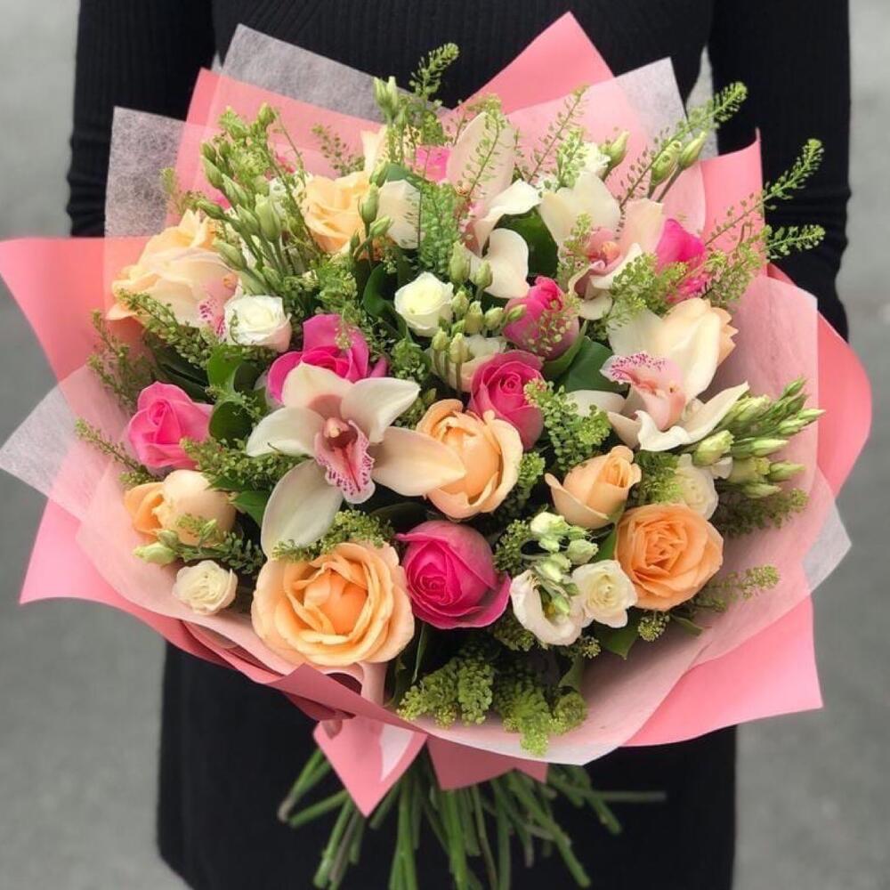 Лизиантус белый – 5 шт.Розовая роза – 8 шт.Кремовая роза – 9 шт.белая орхидея – 5 шт.Гринбелл – 6 шт.Рускус – 16 шт.