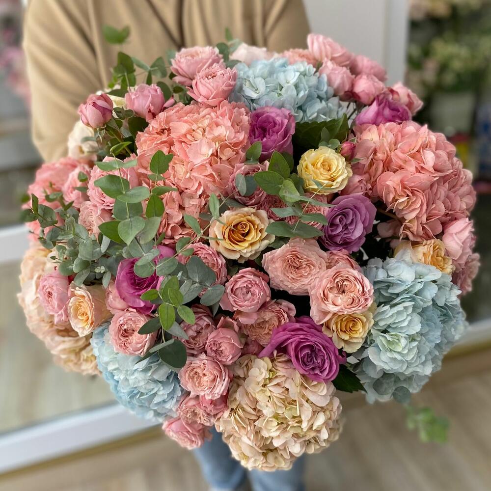 Категорий: Гортензии, Кустовые розы, Пионовидные розы, Розы, Эвкалипт