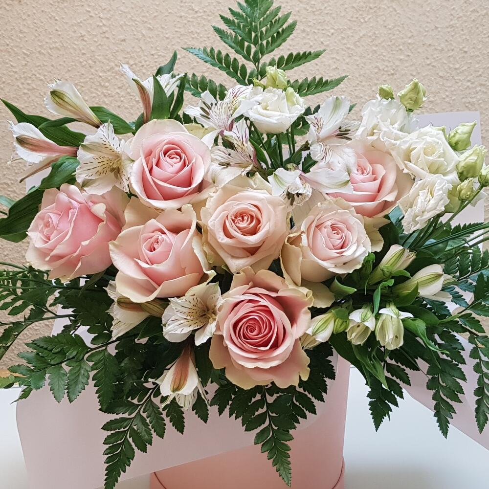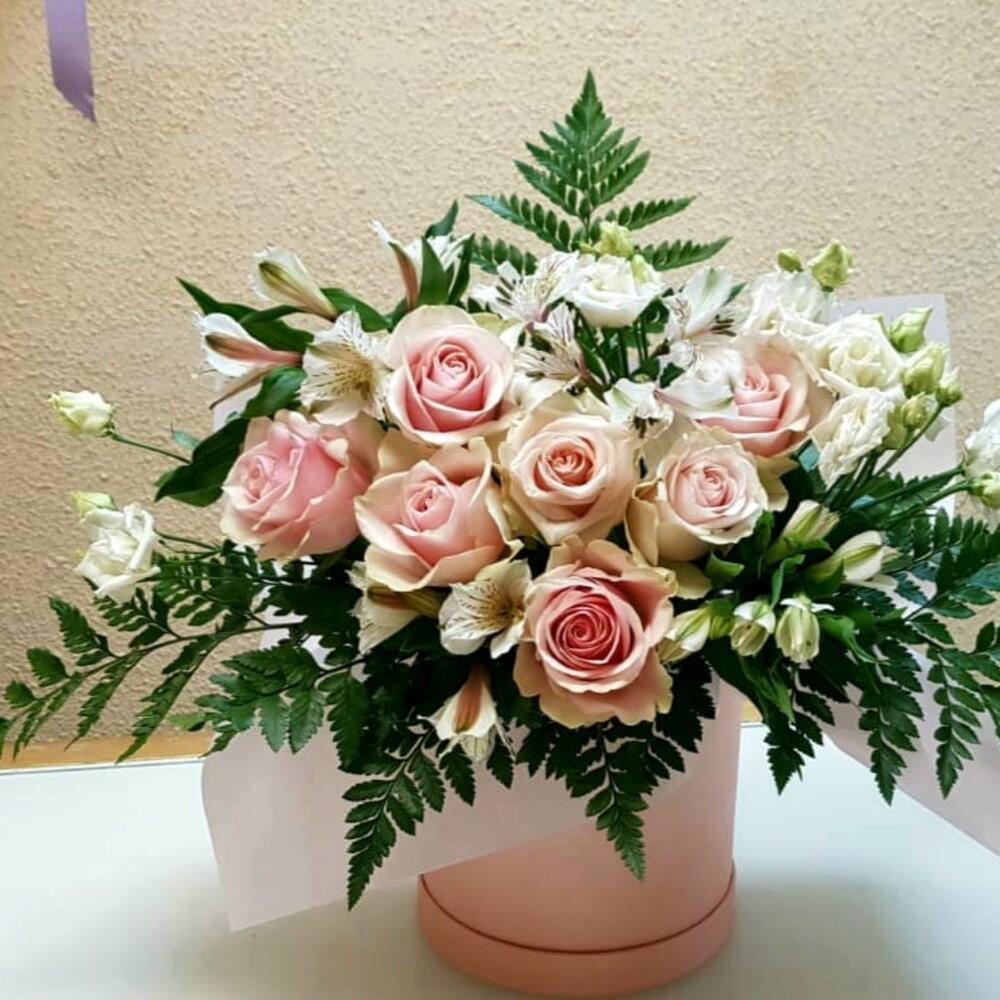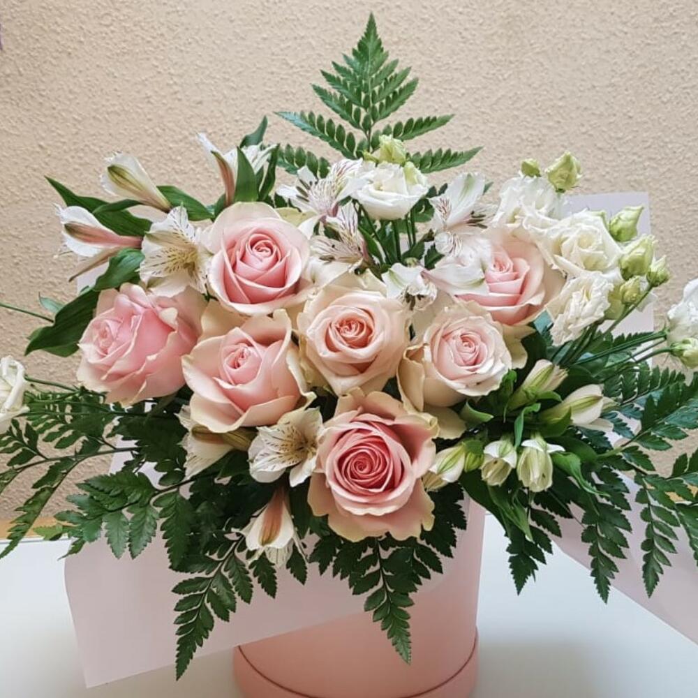 Роза Эквадор – 7 шт.Альстромерия – 4 шт.Листья папоротника – 3 шт.Коробка шляпная – 1 шт.бумага дизайнерская – 1 шт.