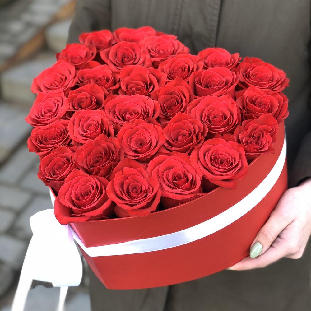 Роза красная – 29 шт. Коробка сердце – 1 шт. атласный бант – 1 шт. Оазис – 2 шт.