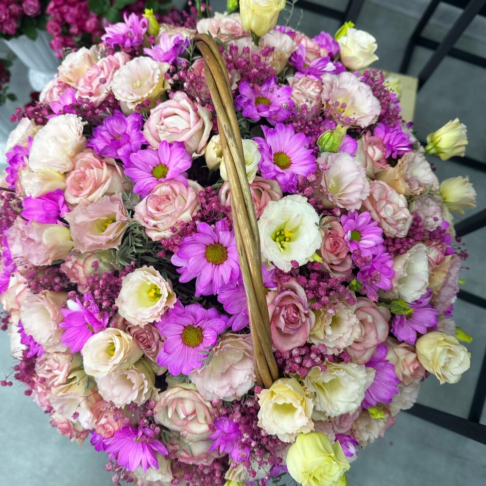 Роза – 29 шт. Хризантема – 33 шт. эустомы микс – 11 шт. Корзина плетеная – 1 шт. зелень декоративная – 5 шт.